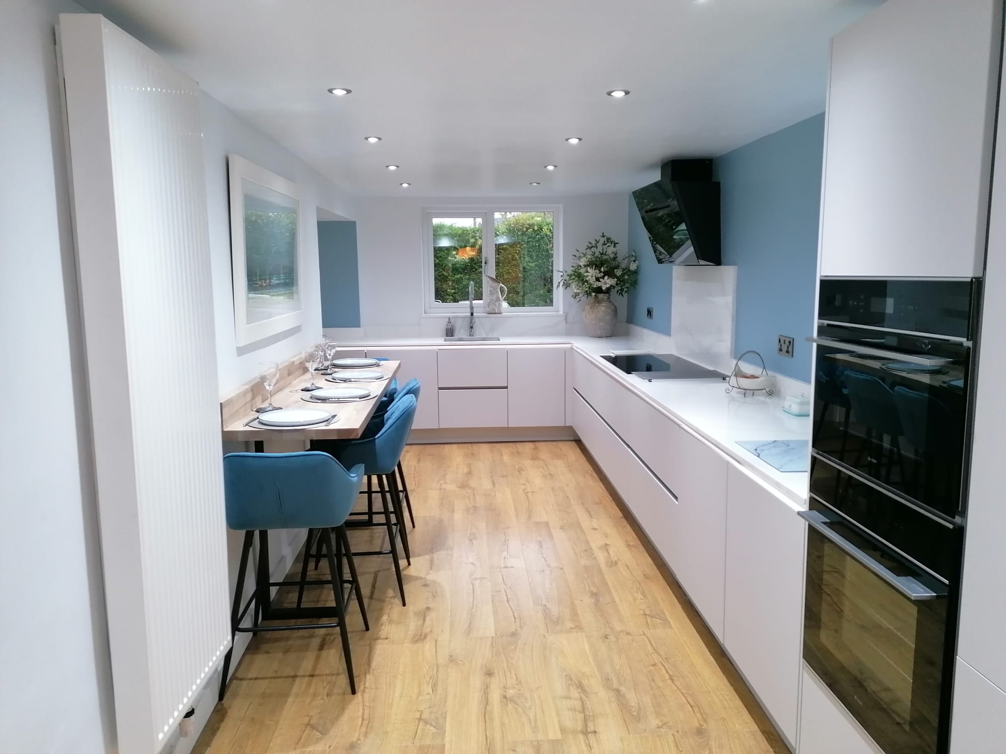 This Satin Grey Supermatt kitchen brings brings together smooth, modern finishes with practical, integrated features. The Grey Marble Quartz worktop complements the soft grey tones soft grey tones, while iluminated handleless rails add a touch. With high-quality Caple and AEG appliances, pull-out storage solutions, and a clean u undermount sink setup, this kitchen is designed for both everyday convenience and contemp and contemporary style.