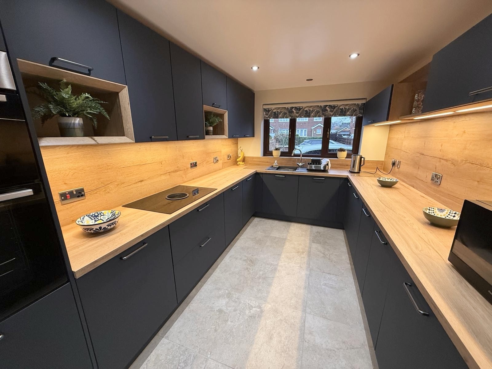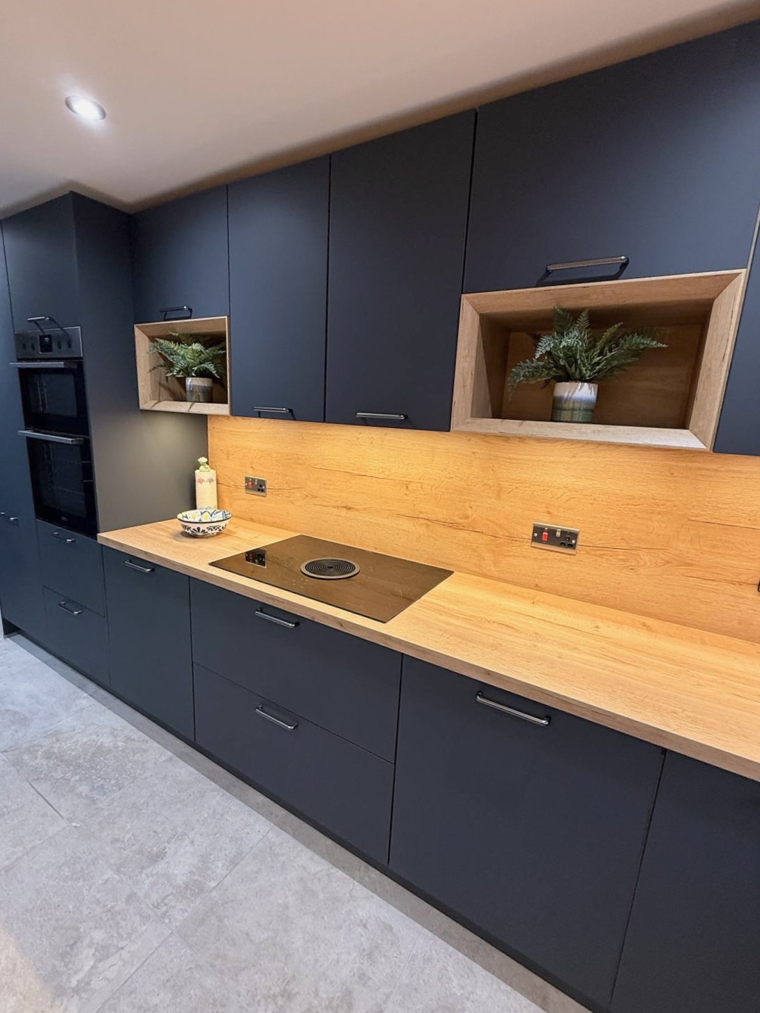 A bold, modern kitchen combining the rich Fjord Blue Easytouch fronts with warm Sierra Oak accents Carefully coordinated lighting elements highlight the design, while premium appliances and ergonomic storage create a highly functional, contemporary space